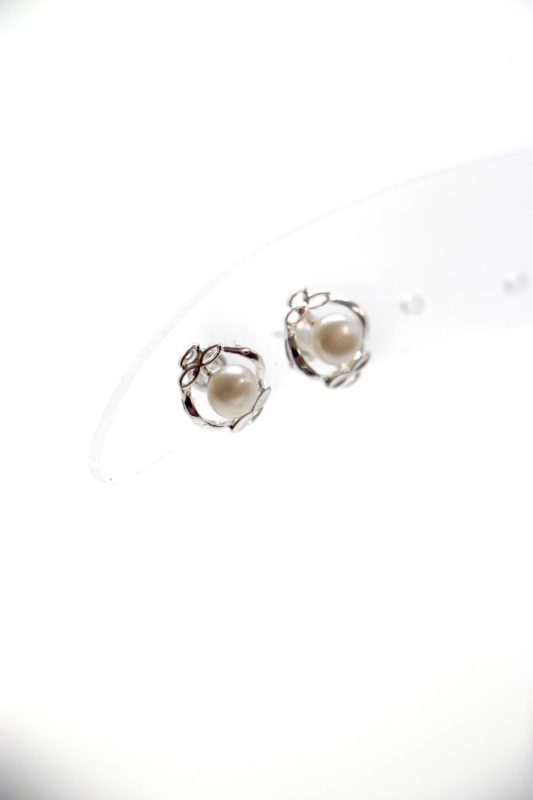 Arete de 1.5 cms, con perla de rio y la base delicada en forma de flor de plata.