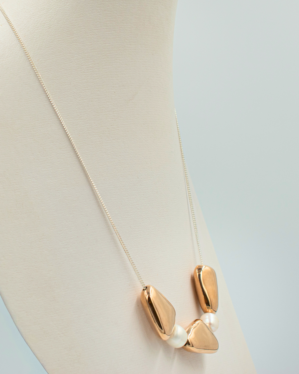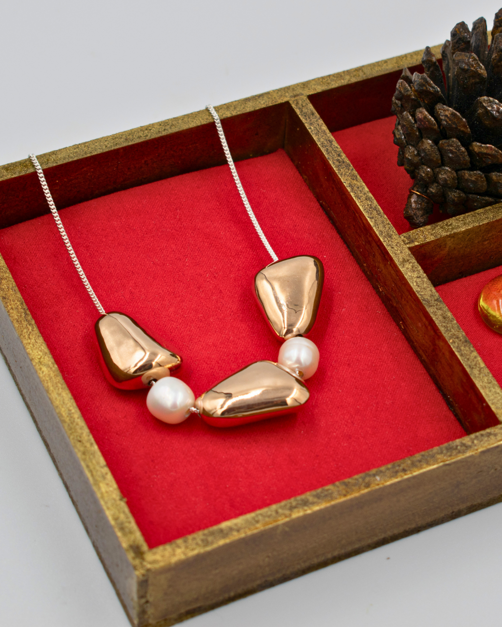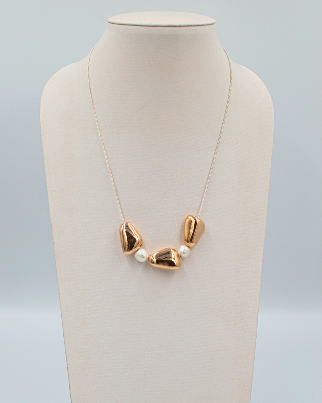 Cadena de plata con 3 dijes y 2 perlas Dijes en forma de cacahuate bañados en oro rosa Largo: 21 cms Medida dijes: 1.5 cm Medida perlas: 0.8mm