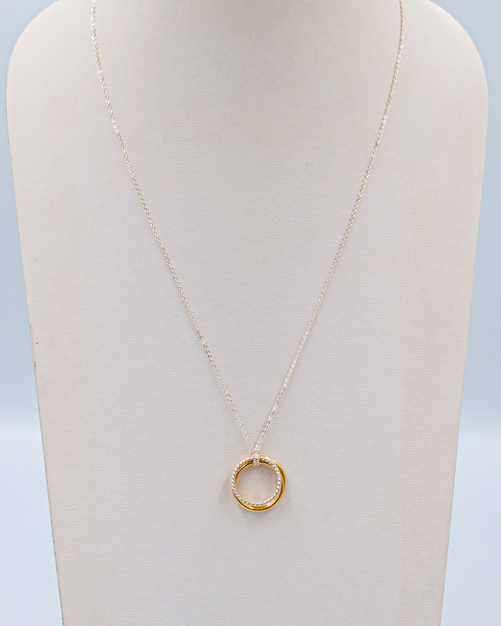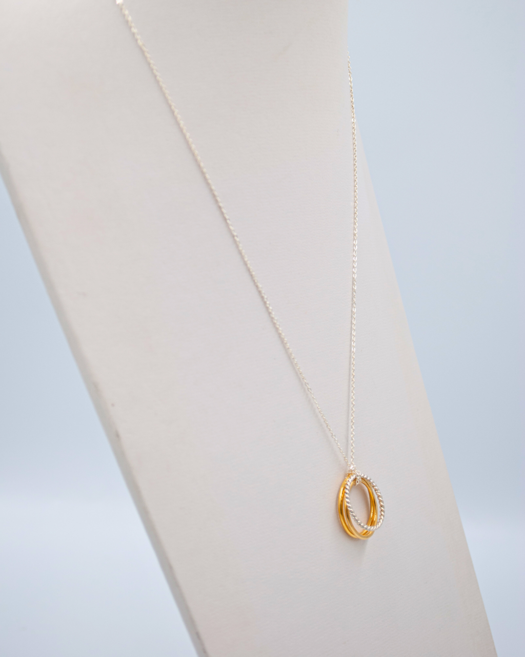 Cadena de plata con dije Dije circular con 3 aros 2 aros bañado en oro y un aro trenzado de plata Largo: 22cms *El dije se puede usar como anillo